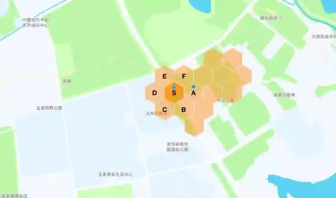 例如,图中将地图划分成了若干蜂窝状区域,并对区域进行了编号:S、A、B、C、D、E、F,绿色点为乘客呼叫位置,蓝色点为可派单范围司机。
