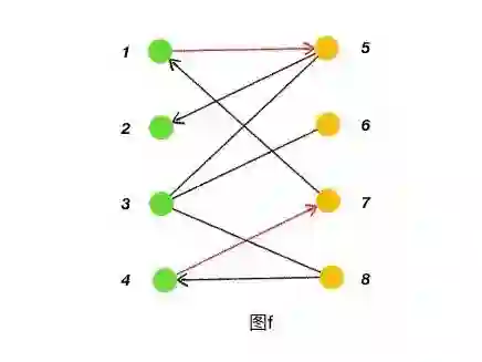 增广路:从一个未匹配点出发,走交替路,如果途经另一个未匹配点(出发的点不算),则这条交替路称为增广路。例如,图 f 中的一条增广路:8→4→7→1→5→2。