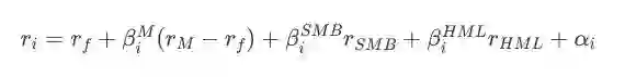 CAPM把投资组合的收益分解为市场收益和无风险资产预期收益两部分。这是个不存在于现实世界的朴素观点。事实上它从提出以来也经历了多次改进,如Fama-French三因子模型。后者把两个风险源扩展为三个风险源——市场、公司规模和公司价值。以下是它的表达式: