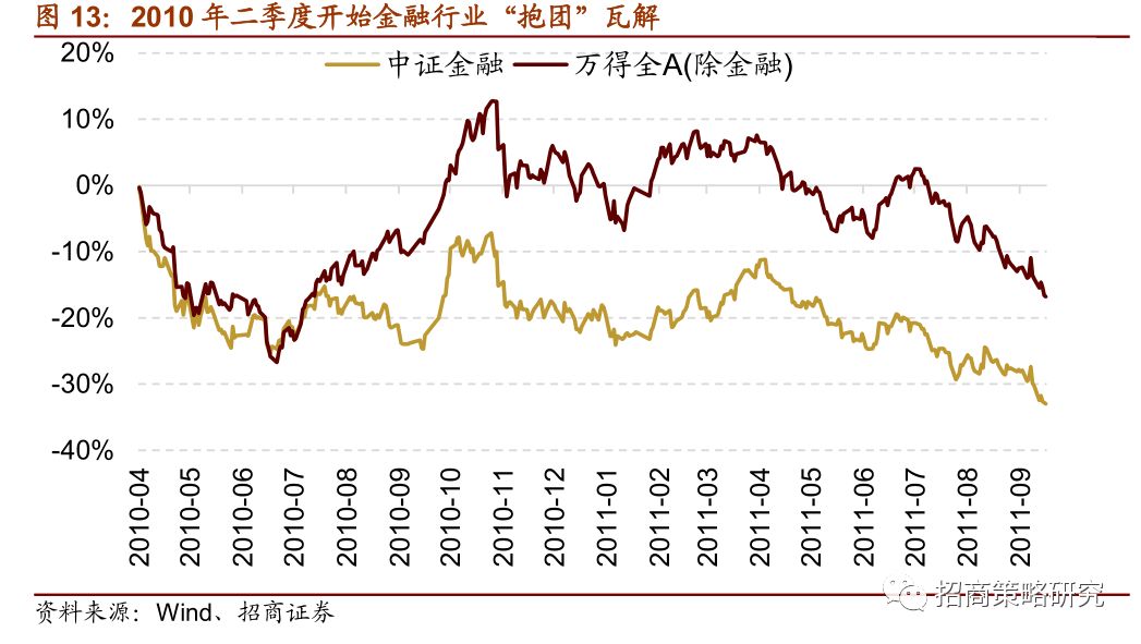 2010年二季度开始,金融的抱团瓦解,接下来一年半,让我们见识了抱团崩坍的结果。到自2010年4月中旬开始,到2011年7月中旬,金融指数整体下跌了20%,而同期剔除金融的指数居然还上涨了2%。到11年9月底,金融指数跌幅已经超过了30%。