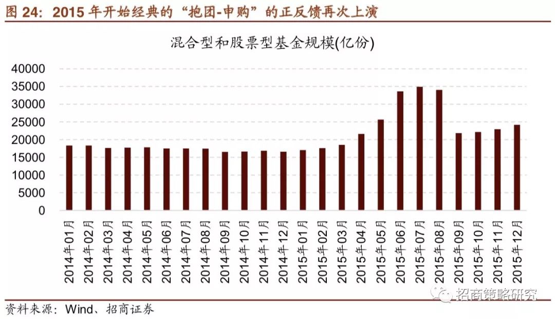 2015年开始,非常经典的“抱团-申购”的正反馈再次上演,但这一次的主角,成为TMT类型产品。混合型和股票型基金的规模自2009年以来再度迎来小爆发,到2015年6月,相比一年前的规模扩张了近一倍,达到3.3万亿份。