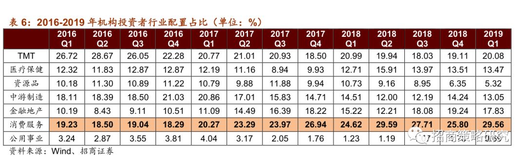 2019年一季度和2016年一季度同样都是社融增速大幅放量,信贷的放量意味着经济要起来,但是经过了若干轮刺激之后,大家对于信贷放量对金融板块业绩的推动已经不抱太高的预期了。因此,投资者的学习效应,使得投资者直接跳过金融板块,加仓消费,除了家电板块业绩逐季度提升外,其他消费板块仍然保持稳定,2016年随后几个季度,机构进行了观望。