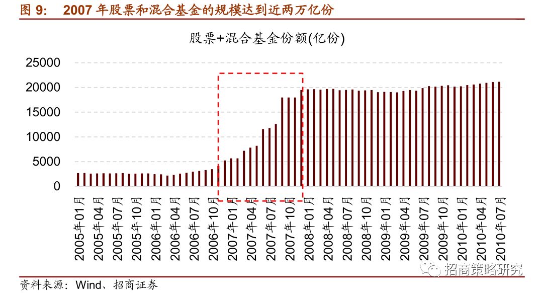 2006年指数的大涨也让投资者对公募基金的关注度大幅提升。2006年12月,单只主动偏股基金发行募集规模达到419亿,也创下了主动偏股型公募基金发行的历史记录,这个规模在同类型产品里到现在也没有被打破。2007年公募基金迎来了大爆发,2007年股票和混合基金的规模达到近两万亿份,是2006年底的近四倍。