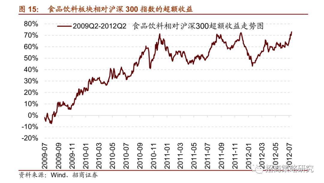 当我们事后来看,食品饮料板块最重要的业绩催化,就是涨价。如果我们将CPI+PPI与国家统计局公布的酒、饮料的利润增速画在一张图上,这种相关性就非常明显。无论是PPI上涨(原材料涨价)、还是CPI上涨(消费涨价)都会使得以白酒为代表的消费品有提价的动力,而且高通胀环境下,提价会比较顺利。因此,食品饮料板块的业绩高点均是出现在CPI+PPI比较高的时候。这个投资逻辑现在已经为投资者所熟知,但是站在2009年,大家仍然需要有一个接受的过程。