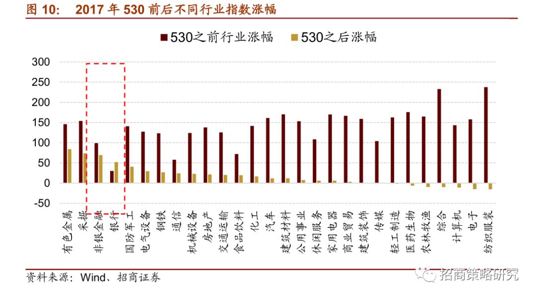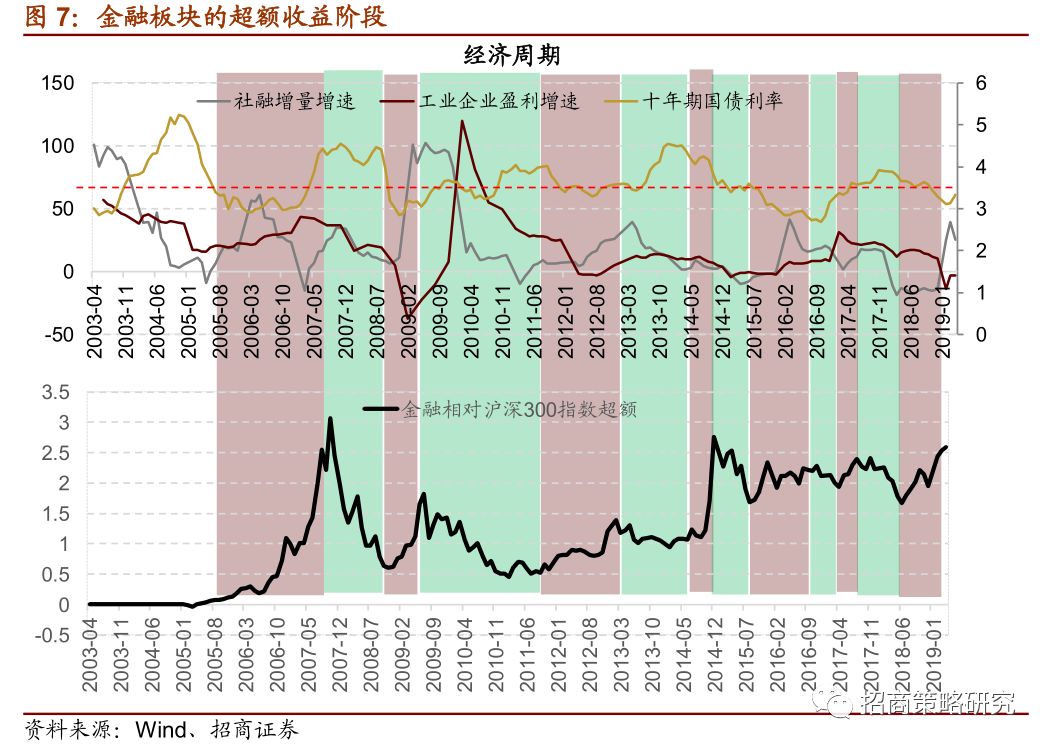后来,投资者逐渐总结出规律,就是金融宽松先买金融。我们进行了总结,从十年期国债利率从上往下击穿3.5%,至社融增速回升,也就是我们称之为金融宽松周期阶段,金融板块相对大盘有超额收益。