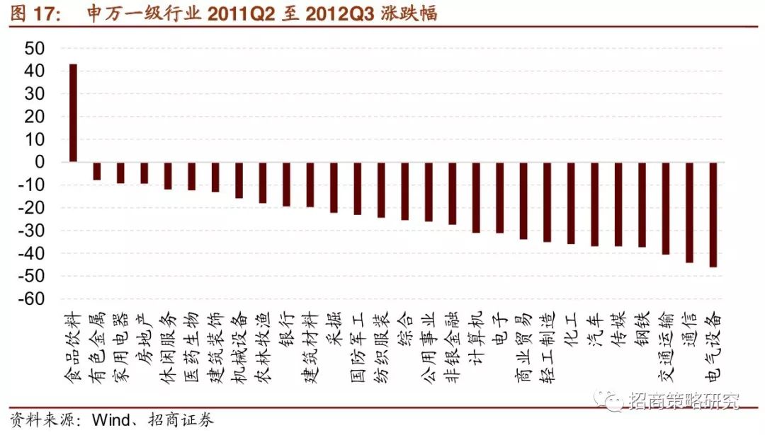 2011-2012年上半年基本是消费一枝独秀,下面这张图可以让读者感受一下什么叫做“抱团”的温暖。2011年4月30日至2012年7月12日指数涨幅,只有一个申万一季行业是涨的那就是——食品饮料。其他行业都感受到了周期下行的痛苦。2011年-2012年也是2005年牛市开启以来,分化最大的时候之一。