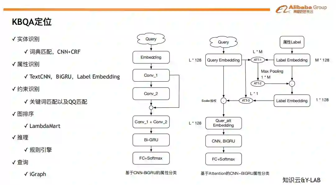 对于 KBQA 的实体识别,我们采用了基于词典的规则方法和基于 CNN+CRF 的实体识别模型。对于属性识别,我们采用了基于 CNN+BiGRU+ Attention 等比较成熟的深度学习分类模型。对于约束识别,采用了关键词匹配和相似匹配的方法。
