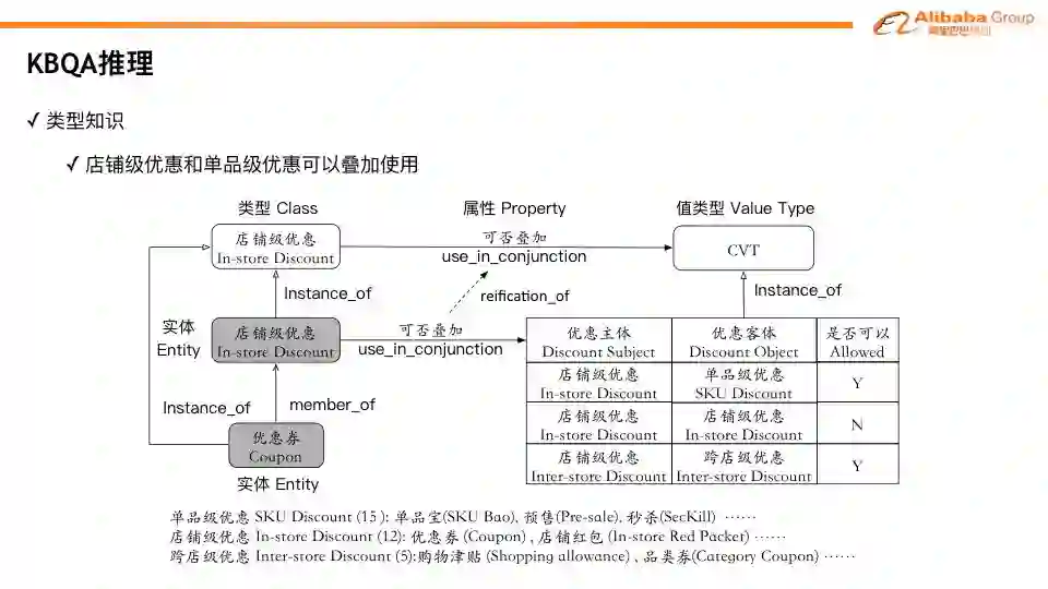 针对实体型知识,我们从实体级别抽象到类型级别,例如 "店铺级优惠和单品级优惠可以叠加使用",进行相应的表示和推理来进行问答。上图展示了如何对类型级别的知识和实体级别的知识进行表示和关联。