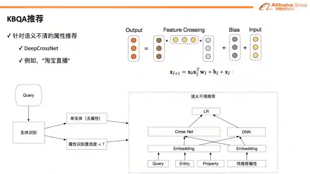 用户问题还有一个经常出现的情况就是 "语义不清"。例如,用户说了 "淘宝直播",其实我们并不知道他具体想要问什么。这种情况下,一般做法是根据热点进行反问。在这里,我们做了进一步的扩展,采用了 DeepCrossNet 技术来进行推荐。我们对 Query 进行实体识别,然后基于热度、问题上下文、Schema 结构等信息对候选的属性进行排序推荐,有效的提升了推荐点击率。