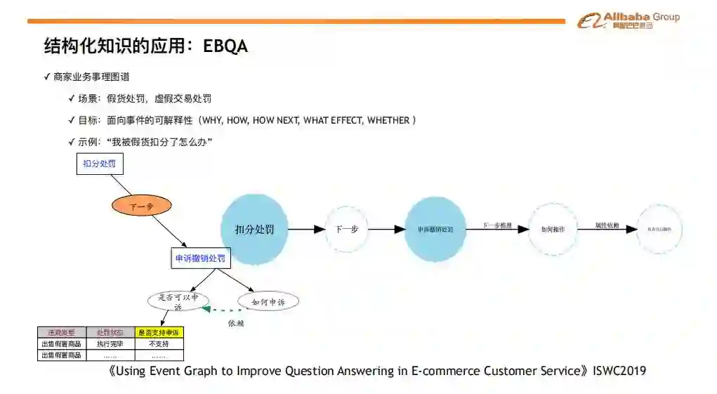 上图的左边展示了结构化以后的知识表示,右边部分展示了 EBQA 的定位和推理过程。针对用户的问题 "我被假货扣分了怎么办",我们首先定位出目标事件 "扣分处罚" 以及相应的属性 "如何处理"。在我们的知识体系中,从 "扣分处理" 我们可以依据 "下一步" 关系推理到关联事件 "申诉撤销处罚",然后根据 "如何处理" 关联到该事件对应的属性 "如何申诉"。因为 "如何申诉" 依赖于 "是否可以申诉",我们需要进一步的推理,并最终根据 CVT 表格来获悉是否支持申诉,如果支持的话需要同时给出申诉入口 ( "如何申诉" 的属性值答案 ),如果不支持的话需要根据 CVT 结构给出对应的解释。