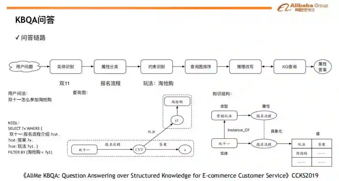 例如:用户问 "双十一怎么参加淘抢购" ( 淘抢购是双十一的一种玩法 ),这里面识别的主实体是 "双十一",属性分类结果是 "报名流程",约束识别是 "玩法:淘抢购",最后根据这些片段组成的查询图,去 KG 中获取答案。