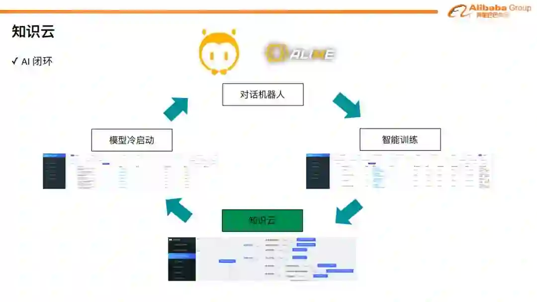 在小蜜的体系中,我们通常基于知识来开发算法模型。在模型的冷启动阶段,我们会借助智能辅助产品 AIBoost,通过人工标注、算法推荐、数据增广相结合的方式,来产生模型的训练语料。在模型开发上线以后,针对模型不能回答的问题,我们会回流补充到训练数据集中,继续训练和优化模型。如果发现是因为知识缺失造成不能回答,我们会对知识进行相应的补充。整个过程构成了一个完整的 "AI 闭环"。