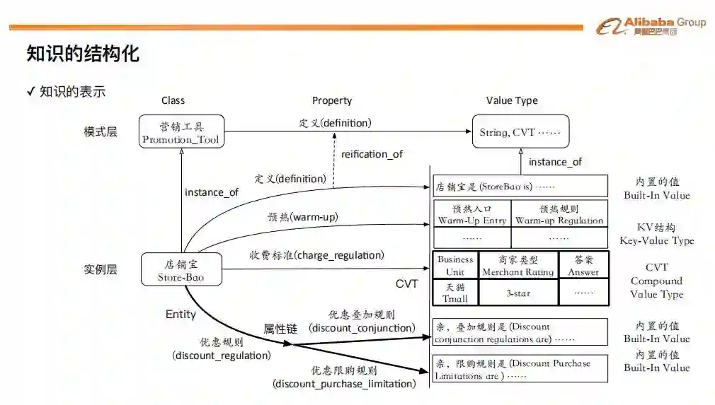 下图是结构化知识表示的一个示例。其中,"营销工具" 是一个类型,店铺宝是一个实例,一种具体的营销工具。"定义","预热","收费标准","优惠规则" 是属性。其中,"预热" 的属性值是一个 KV 结构 ( 可以支持更为精细的定位 ),收费标准的属性值是一个 CVT ( 不同的 BU 不同的商家类型收费标准不一样 ),"优惠叠加规则" 和 "优惠限购规则" 是 "优惠规则" 的子属性。