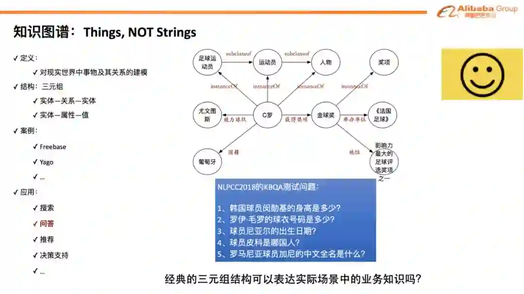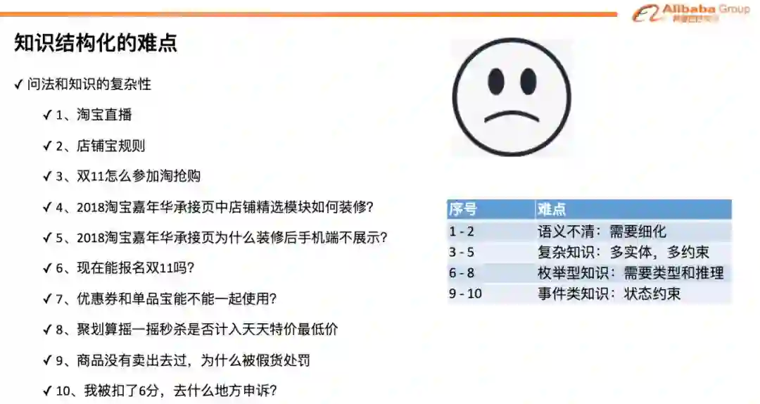 提到知识的结构化,我们首先会想到的通常是知识图谱 ( KG ) 和经典的三元组结构:"实体-关系-实体" 和 "实体-属性-值" 这样的表达。但遗憾的是,这样的经典三元组结构表达能力是有限的,在实际场景中无法全面的表达业务知识。下图列举了实际场景中的一些 QA 知识,并总结了知识结构化的一些难点。