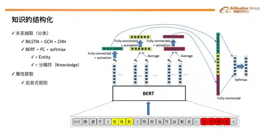 对于关系的抽取,我们尝试了图神经网络 GCN 和 BERT,BERT 的表现效果更好。在 BERT 的输入中,我们引入概念/实体信息 ( 图中的 "吃母乳" 和 "添加辅食"),对 BERT 的输出中实体对应的多个字向量进行 averaging 和 FC ( full-connection ) 操作;另外,我们尝在实体两侧加上分隔符 ( $ 和 # ) 来显示的告诉模型分隔符中间是概念/实体,可以进一步得到明显的提升。系列实验不仅证明了预训练语言模型的有效性,而且验证了引入实体知识可以有效的提升效果。
