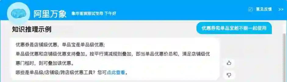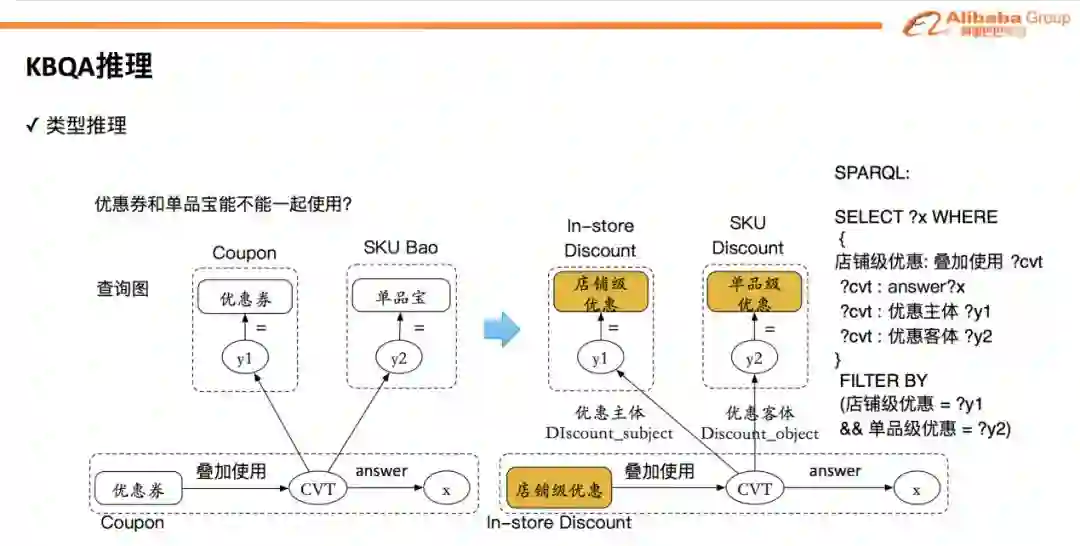 问答过程中,如上图所示,经过类型推理以后,问题 "优惠券和单品宝能不能一起使用?" 会被改写成 "店铺级优惠和单品级优惠能不能一起叠加使用",并且最终通过查询 KG 返回对应的答案。