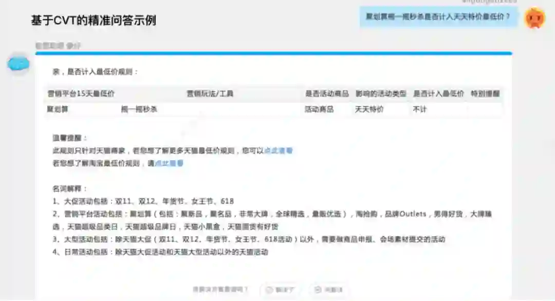 KBQA 目前已经在阿里小蜜的大促机器人、商家机器人 ( 万象 )、淘宝直播的直播小蜜机器人等场景实际落地,并且经受了双11的洗礼,取得了非常不错的效果。下列 Demo 对 KBQA 的问答效果进行了一个简单的展示。