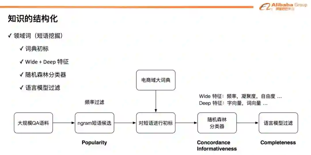 在实际的落地过程中,我们从 QA 知识和语料出发来进行具体的知识结构化。整体步骤是先进行基于短语的领域词挖掘,然后基于挖掘的领域词进行概念/实体提取,进一步获得属性和关系,然后人工校验并且设计更为精细和复杂的 CVT 结构。下面分别对每一步骤进行详细介绍。