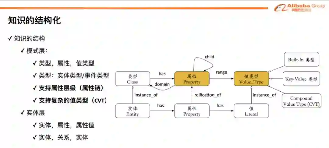 通过上述的短语挖掘、概念/实体提取、关系/属性提取,我们可以得到初步的知识结构。这个结构需要业务同学进行人工校验,同时对属性值的 CVT 结构进行设计和加工,最终形成我们的 Schema 结构,并且完成实体级别知识的录入。