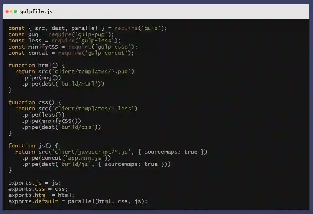 除了上述的RxJS,管道模式在前端领域也有很多应用,主要集中在前端工程化领域。例如'老牌'的项目构建工具Gulp, Gulp使用管道化模式来处理各种文件类型,管道中的每一个步骤称为Transpiler(转译器), 它们以 NodeJS 的Stream 作为输入输出。整个过程高效而简单。