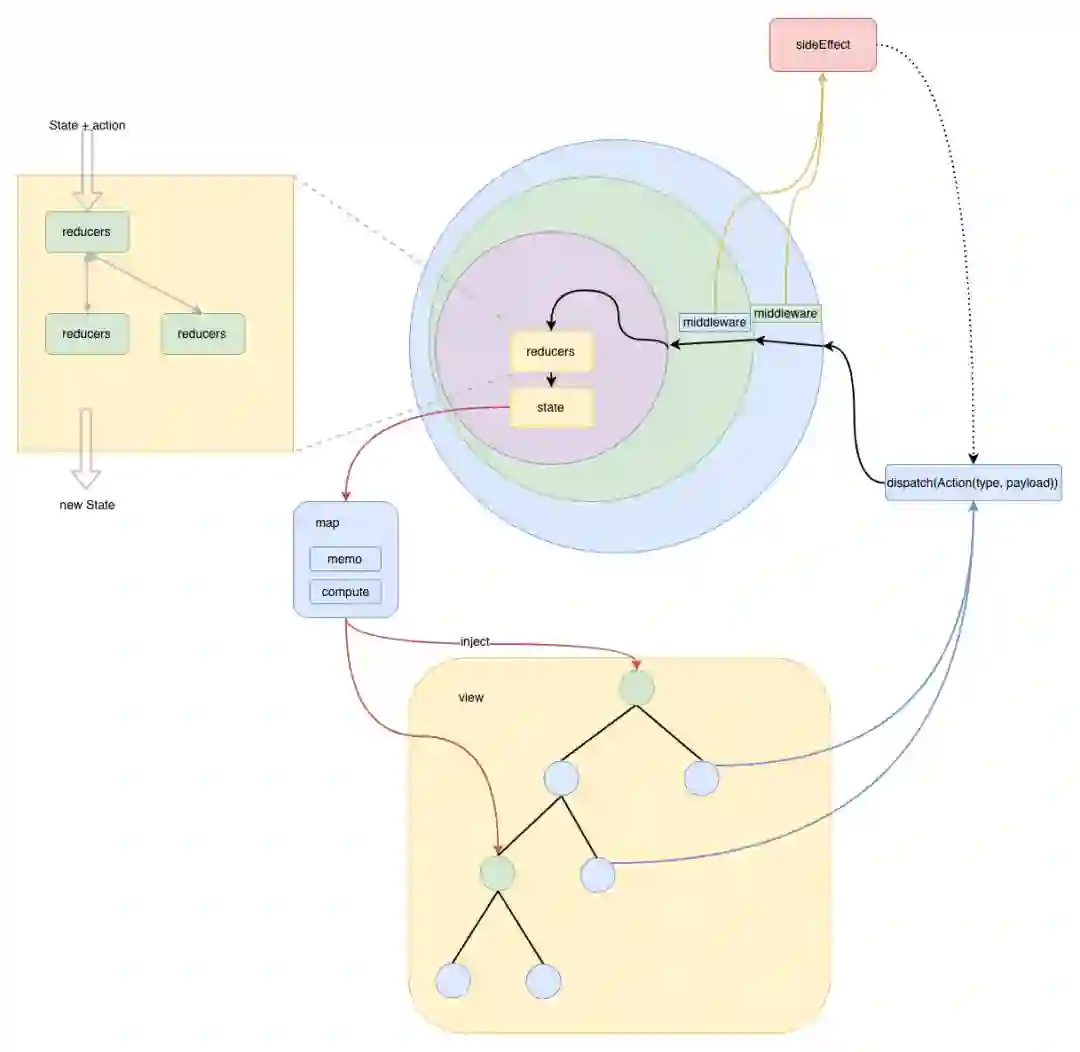 上面两个特点是Redux架构风格的核心,至于Redux还强调不可变数据、利用中间件封装副作用、范式化状态树,只是一种最佳实践。还有许多类Redux的框架,例如Vuex、ngrx,在架构思想层次是一致的: