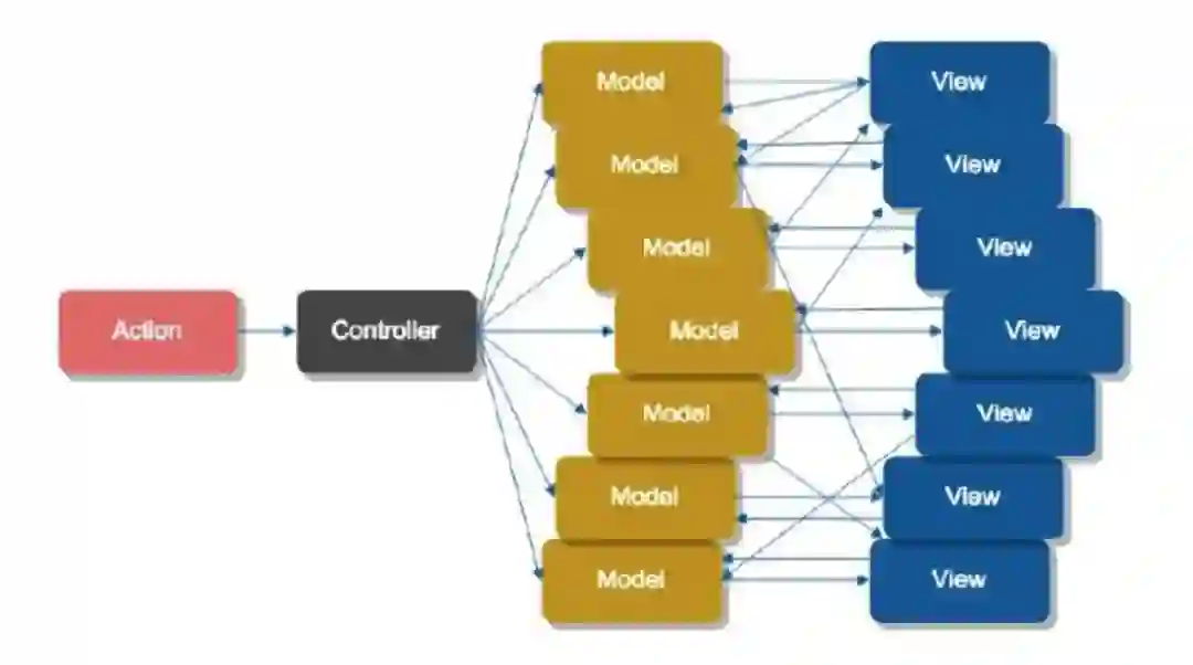 单一数据源, 首先解决的是传统MVC架构多模型数据流混乱问题(如下图)。单一的数据源可以让应用的状态可预测和可被调试。另外单一数据源也方便做数据镜像,实现撤销/重做,数据持久化等等功能