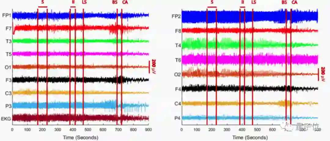 下面这张图,显示了这900秒期间的EEG输出,不同颜色代表不同电极附着的不同头皮区域,其中左图指代左脑半球,右图指代右脑半球。