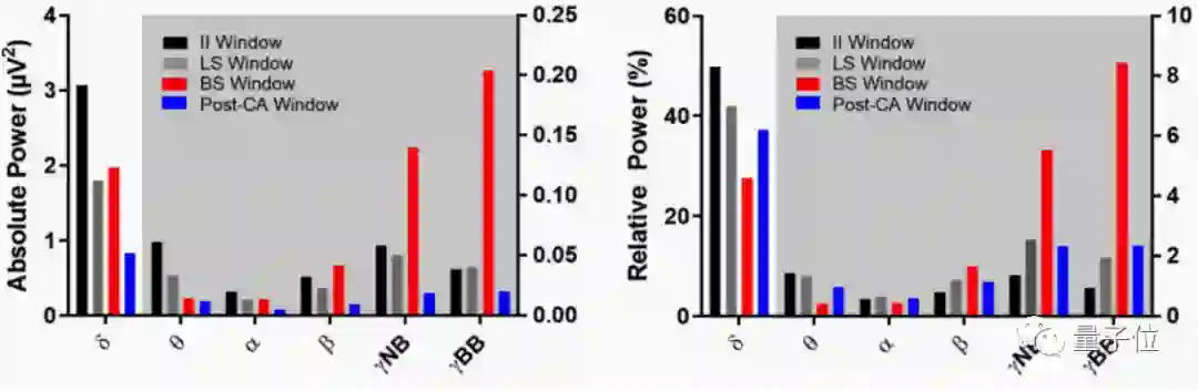 通过进一步分析这几个时间节点中,脑电波频率和幅值发生的变化,可以发现在患者接近死亡的时候,γ脑电波功率明显变高了。