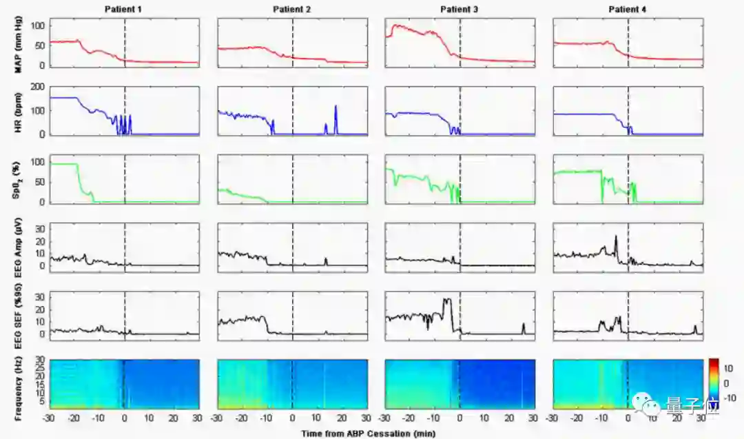 不过,相比于这个在治疗中意外死亡记录的脑电波,这几名重症患者是在经过家属同意后,研究人员主动关闭生命维持设备,并记录脑电波变化的情况。