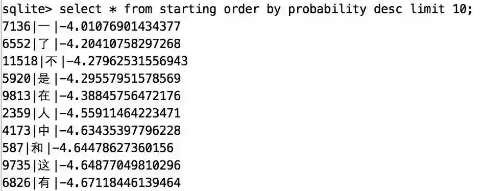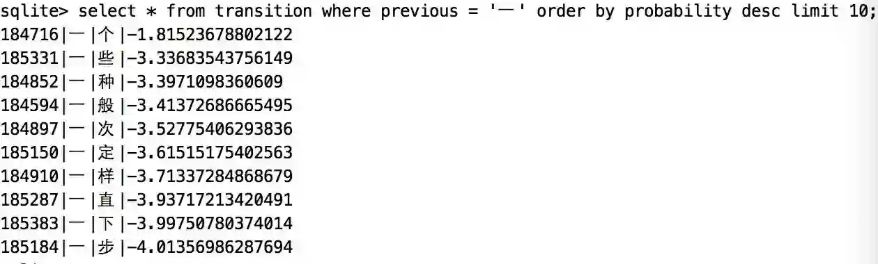 此处用到的是最简单的一阶隐马尔科夫模型,即认为在一个句子里,每个汉字的出现只和它前面的的一个汉字有关,虽然简单粗暴,但已经可以满足大部分情况。统计的过程就是找出字典中每个汉字后面出现的汉字集合,并统计概率。因为这个概率矩阵非常的大,逐条数据写入数据库过慢,后续可以优化为批量写入,提高训练效率。结果如下: