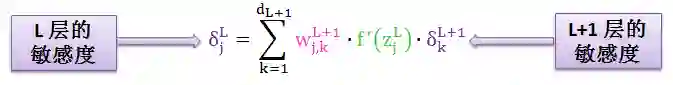 现在看公式左右两边,我们已经建立了 L 层和 L+1 层的敏感度的关系,即用“L+1 层 dL+1 个敏感度 δkL+1”来表示“L 层 1 个敏感度 δjL”。