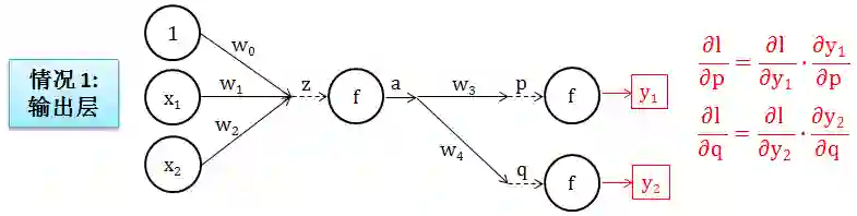 情况 1:如果到了输出层,我们就到头了,因为 ∂l/∂p 可以显性写出。而这是因为 ∂l/∂y1 可以显性写出 (试想损失函数 l 是 y 的平方差函数),也因为 ∂y1/∂p 可以显性写出 (y1 是分数 p 经过转换函数 f 加工出来)。上述所有推理对 ∂l/∂q 也适用。如下图所示: