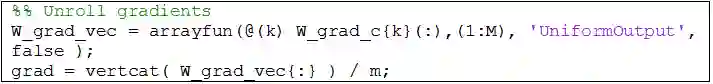 其中 arrayfun 是将“元胞数组变成向量”这个操作应用在每个 W_grad_c 的元素上,由于该操作的 output 是大小不同的 array,因此'UniformOutput'应该设为 false。