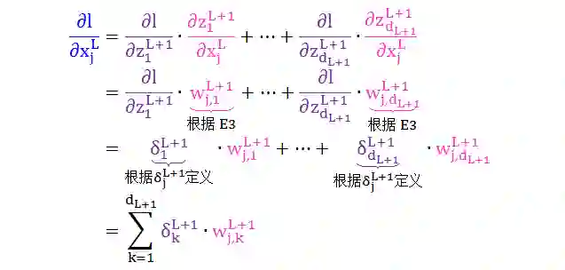 其中第二行根据 zkL+1 的表达式,第三行根据 δkL+1 的定义,第四行用累加符号简化表达式。