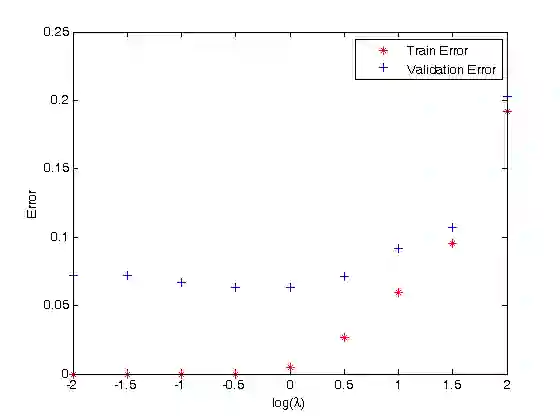 为了选择最优 λ,我们将 5000 个数据集随机分成 4 比 1,4000 个用做训练调权重,1000 个用作验证选 λ,给定一组 λ = {10-2, 10-1.5, 10-1 …,10, 101.5, 102},画出训练误差和测试误差: