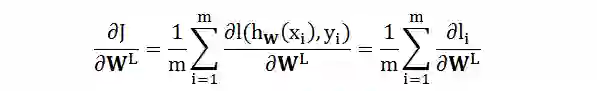 代价函数 J 是损失函数 l 的简单加总,J 对参数 WL 的偏导数可以分解成