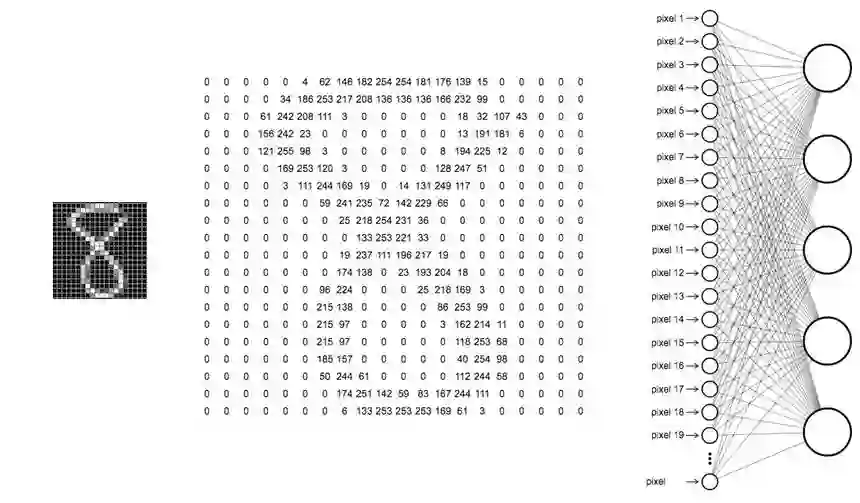 下图展示如何将数字 8 的照片分解成 400 个像素,并将这 400 个像素对应的灰色强度值作为神经网络的输入层上的 400 个节点。
