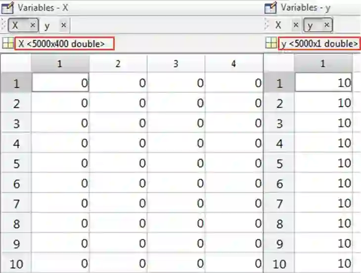用矩阵 X 代表整个数据集的输入 (input),将 20×20 像素的网格“展开”成 400 维的向量。每一个示例的输入是 X 的一行,那么 X 的大小是 5000×400