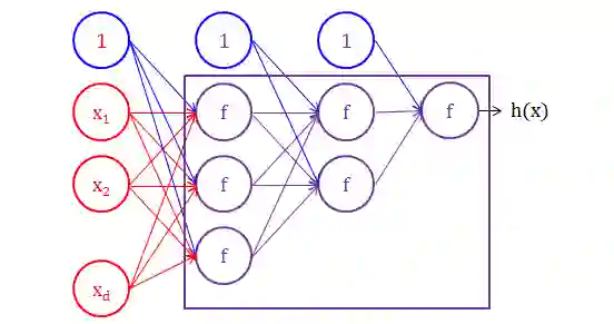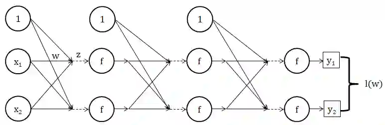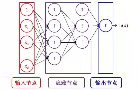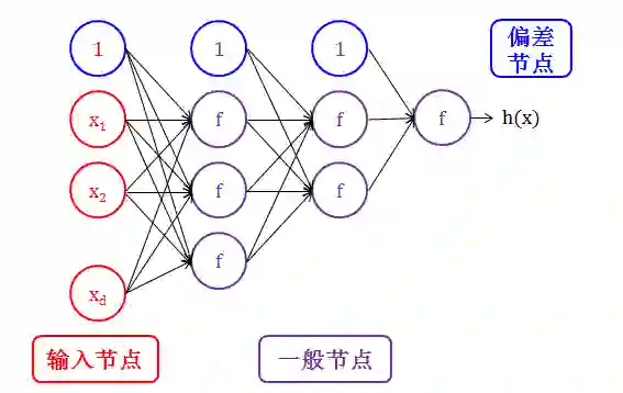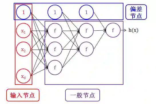 除输出层的每一层都有一个特殊的节点叫做偏差节点 (bias node),该节点没有输入箭头 (incoming arrow) 只有输出箭头 (outgoing arrows)