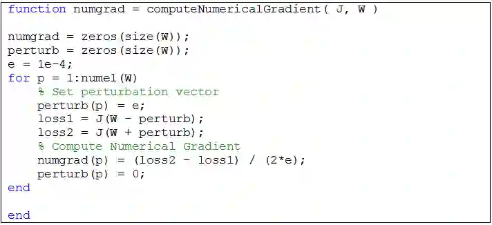 用反向传播算出梯度后,就可以用梯度下降来最优权重了。但是怎么能保证反向传播算出的梯度就是对的呢?一个有效的方法就是用有限差分 (finite difference) 来数值解的梯度 F,和反向传播算出的梯度相比。过程如下: