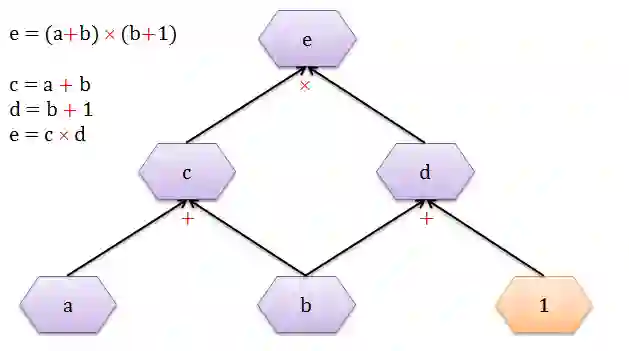 用 c = a + b,d = b + 1 的代换,画出下面的计算图 (computational graph)。图中有三个运算符:2 个加法 (+) 和 1 个乘法 (×)。紫色六边形里面的是变量,橙色六边形里面是常数。
