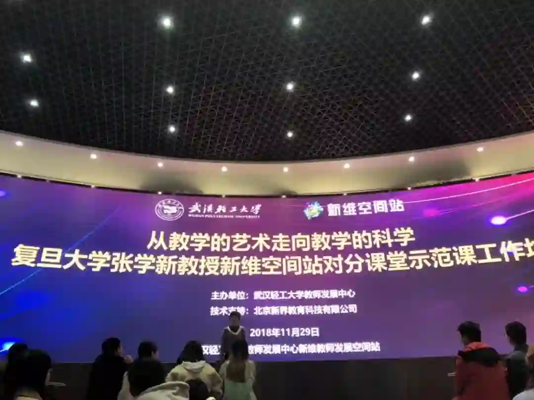 2018年11月29日周四14:00-17:00,武汉轻工大学教师发展中心与北京新界教育科技有限公司“新维空间站”联袂推出:史上首次创始人张学新教授对分课堂示范课工作坊!与来自武汉轻工大学40名本科生一起,精彩上演《脑与学习科学(入门篇)》对分示范课,解码和观摩对分课堂的实效与魅力,展示智慧技术与对分课堂的深度融合!示范课后开展《对分课堂:从教学的艺术走向教学的科学》专题报告,创始人亲自呈现和诠释对分课堂教学新模式,现场来自武汉理工大学、华中师范大学、四川外国语大学、中南财经政法大学、云南师范大学、武汉轻工大学、湖北大学、汉江师范学院、湖北工业大学、湖北商贸学院、湖南理工学院、四川化工职业技术学院、武汉城市职业学院、武汉船舶职业技术学院、武汉工商学院、武汉华夏理工学院、武汉铁路职业技术学院等20+所院校教师和管理岗参与示范课观摩和报告,线上直播约3000人观看。本次工作坊由武汉轻工大学覃晶晶老师担任主持,武汉轻工大学教师发展中心张胜全主任致辞。