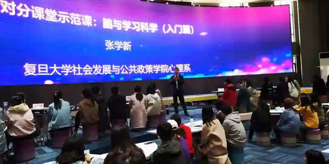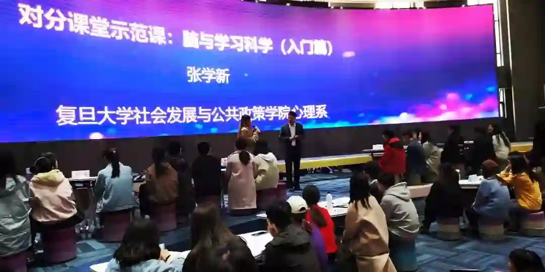 对分课堂创始人复旦大学张学新教授亲授示范课《脑与学习科学(入门篇)》,以两次当堂小对分情景剧形式,让现场和远端师生们可以一边观摩对分课堂的原汁原味,一边体验智慧技术“新维空间站”与对分课堂的深度融合!