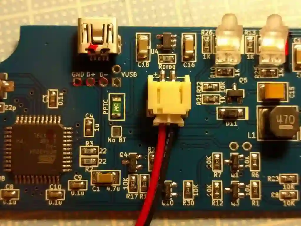 测试蓝牙,将任意 microUSB 数据线插入板子上并接入电源,此时可以通过手机或电脑测试蓝牙功能是否正常(如果不正常的话,可能你需要找 Hasu 去要售后去了)。