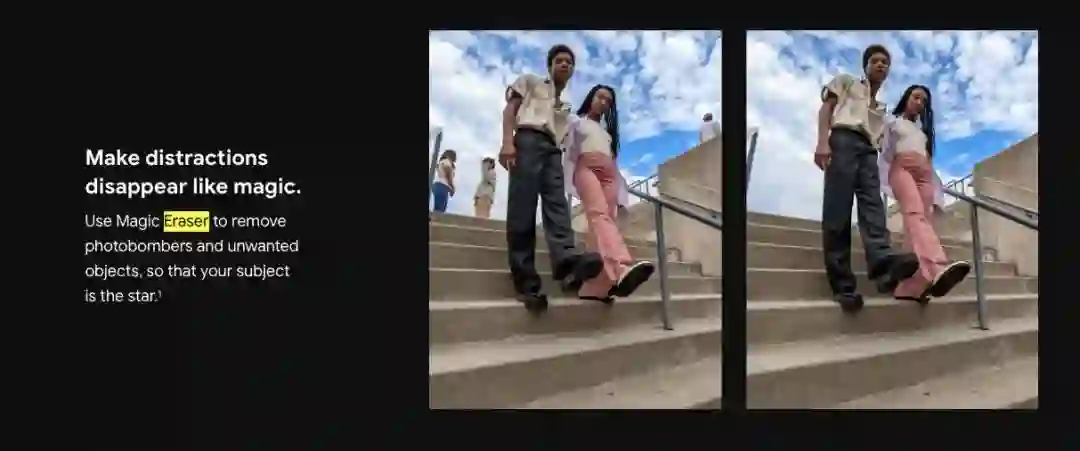 新曝光的宣传资料显示,Pixel 6 系列可以在无需联网的情况下,处理实时拍照翻译。同时,新机还支持了背景“魔术擦”,可以将照片画面多余的人或物几乎无痕迹地“擦”掉。
