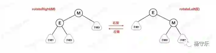 上图包含了左旋和右旋的示意图,这里以右旋为例进行说明,右旋节点 M 的步骤如下: