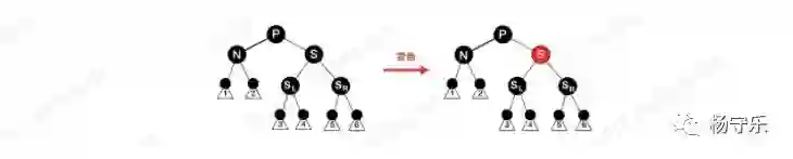 N 的父节点,兄弟节点 S 和 S 的孩子节点均为黑色。这种情况下可以简单的把 S 染成红色,所有经过 S 的路径比之前少了一个黑色节点,这样经过 N 的路径和经过 S 的路径黑色节点数量一致了。但经过 P 的路径比不经过 P 的路径少一个黑色节点,此时需要从情况一开始对 P 进行平衡处理。