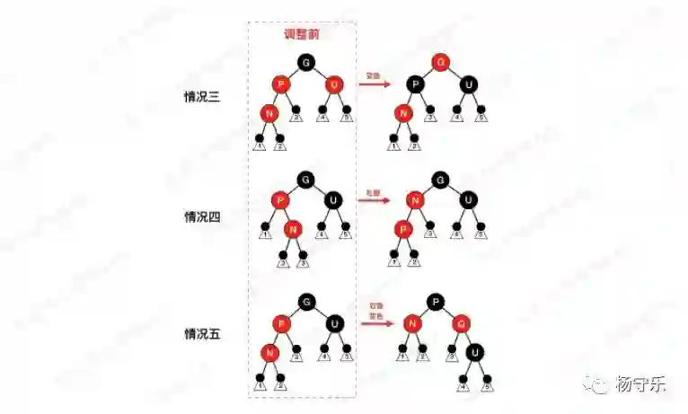 上面五种情况中,情况一和情况二比较简单,情况三、四、五稍复杂。但如果细心观察,会发现这三种情况的区别在于叔叔节点的颜色,如果叔叔节点为红色,直接变色即可。如果叔叔节点为黑色,则需要选选择,再交换颜色。当把这三种情况的图画在一起就区别就比较容易观察了,如下图: