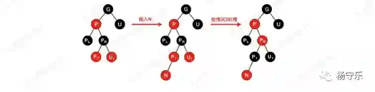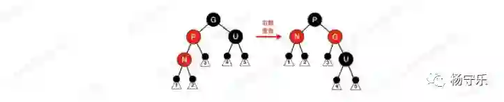 N 的父节点为红色,叔叔节点为黑色。N 是 P 的左孩子,且节点 P 是 G 的左孩子。此时对 G 进行右旋,调整 P 和 G 的位置,并互换颜色。经过这样的调整后,性质4被恢复,同时也未破坏性质5。