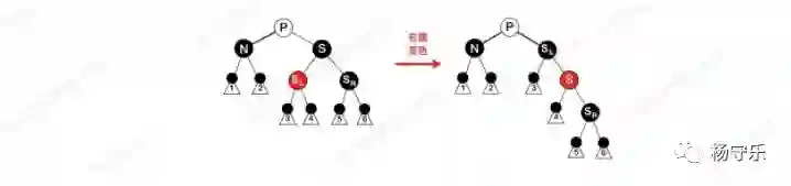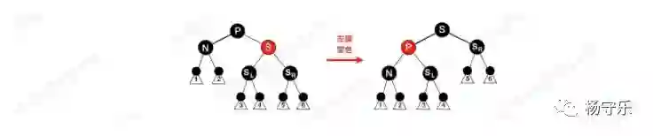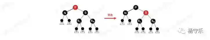 N 的父节点是红色,S 和 S 孩子为黑色。这种情况比较简单,我们只需交换 P 和 S 颜色即可。这样所有通过 N 的路径上增加了一个黑色节点,所有通过 S 的节点的路径必然也通过 P 节点,由于 P 与 S 只是互换颜色,并不影响这些路径。